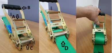 Staat er veel spanning op de spanband? Dan kan het zijn dat handvat A moeilijk in beweging komt. Het kan dan helpen om handvat B richting de last te duwen en tegelijkertijd handvat A aan te trekken.