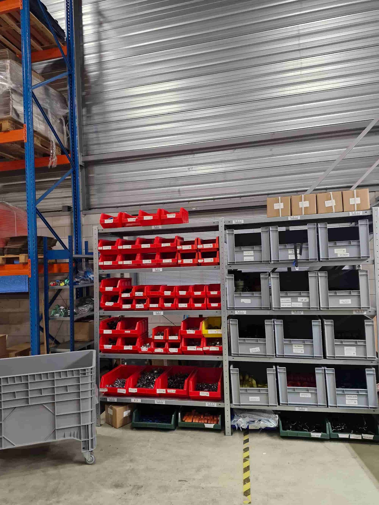 Maak gebruik van flexibele stellingen: Gebruik opslagsystemen die eenvoudig kunnen worden aangepast of verplaatst. Zo kun je snel inspelen op veranderingen in de voorraad. Het gebruik van bakken en koffers of kunststof pallets kan hierbij helpen.