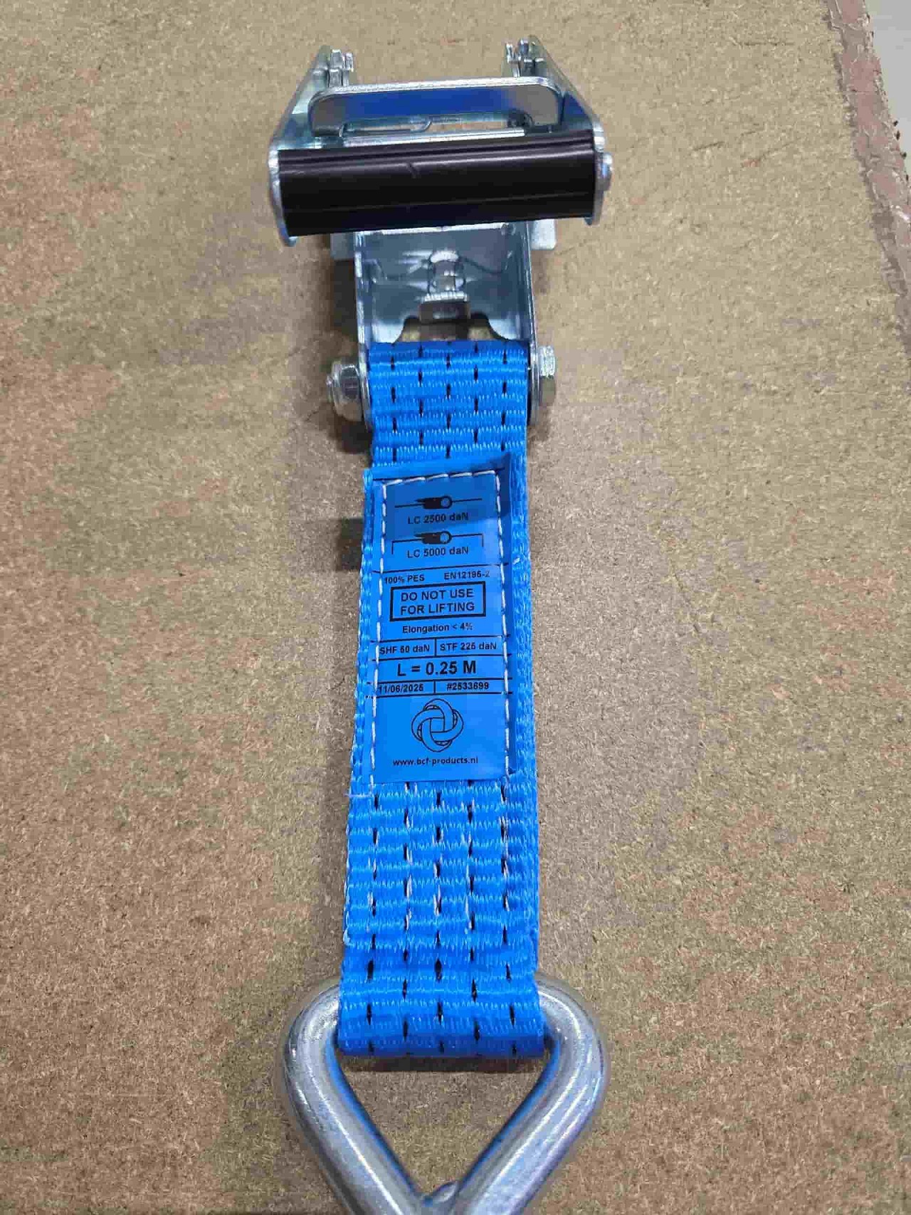 Het label moet op beide delen van een tweedelige spanband aanwezig zijn (zowel op het vaste ratelgedeelte als op het losse bandgedeelte). Als het spanband label ontbreekt of onleesbaar is, mag je de spanband niet gebruiken. Zonder een leesbaar label voldoet de band niet aan de norm en kun je niet aantonen dat hij geschikt is voor veilig gebruik.