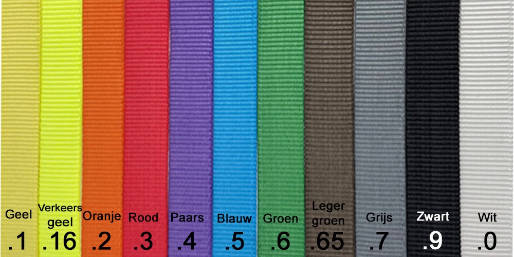 Geel, verkeersgeel, oranje, rood, paars, blauw, legergroen, groen, grijs, zwart en wit