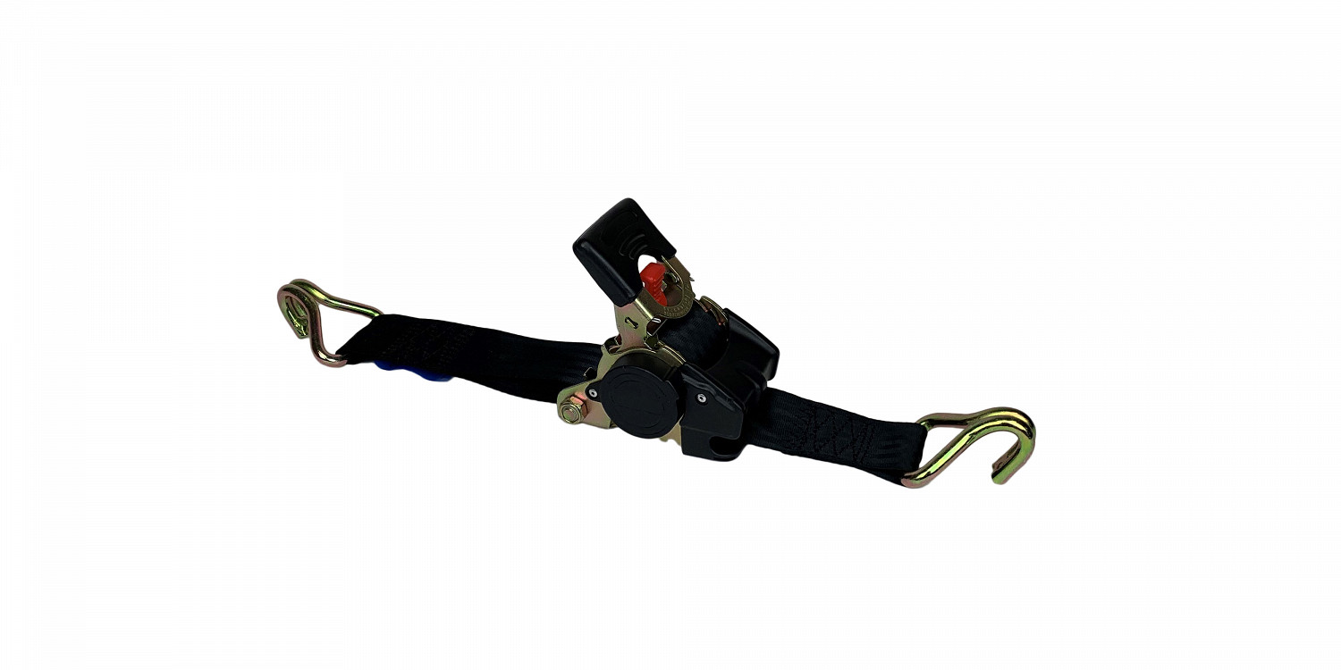 Deze zelfoprollende spanband bestaat uit één geheel. Als de band is opgerold, bevindt het band zich in de behuizing in het midden. Aan de ratelzijde bevindt zich een kort stuk band van ongeveer 10 cm met daaraan een haak/fitting. Door de rode knop in te drukken op de ratel, kan het band automatisch worden opgerold of handmatig worden uitgerold tot op de gewenste lengte. Door het gebruik van de zwarte ratel kan de band eenvoudig worden aangespannen zodat de lading goed vast staat.