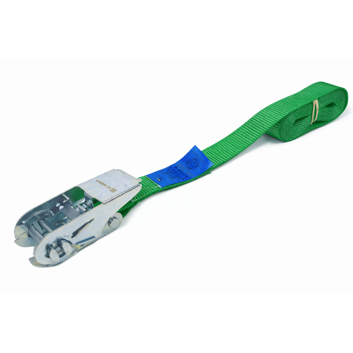 Deze 25 mm brede spanband is eendelig, ook wel eindloos genoemd. Aan de ratel zit alleen een band vast. Het uiteinde van de band steek je door de ratel, deze trek je vervolgens aan en breng je op spanning doormiddel van de ratel. 400/800 daN.