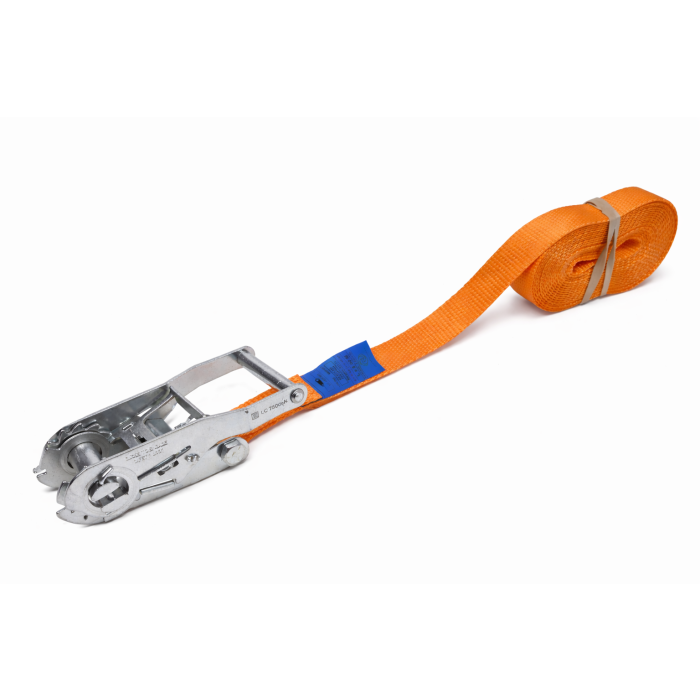 Deze 25 mm brede spanband is eendelig, ook wel eindloos genoemd. Aan de ratel zit alleen een band vast, 750/1500 daN. Het uiteinde van de band steek je door de ratel, deze trek je vervolgens aan en breng je op spanning doormiddel van de ratel.